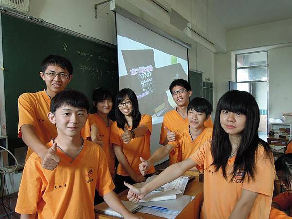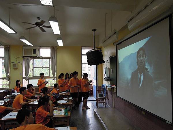 照片內左前方的同學,是這組報告的組長。在報告結束後,全體組員在鏡頭前, 以大大的笑容和大姆指對他表達肯定和謝意--因為他多付出時間心血來投入全組影片的後製;因為他願意持續在組員之間協調、因為他再三檢查電腦軟體和硬體,這一小組報告也能更加完整。這個movie project,除了要將英文學習主動權(內容)交給學生,也能提供學生一同學習,一同成長的機會。紙筆測驗無法完整的呈現每一個學生的真正高度和優秀特質; 在這報告過程中, 組員彼此能看到每個人的長處,提醒自己要表現更好。二十年後,當他們再次回想這次報告的經驗,他們心中的感受和共同回憶,應是任何一張考卷都無法相比的。